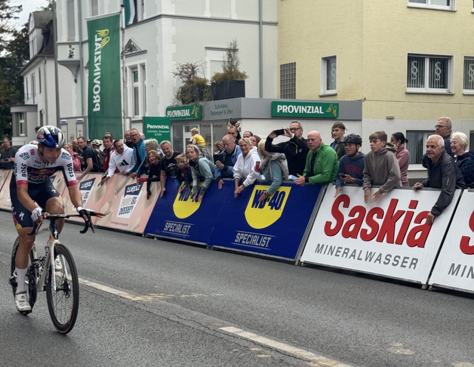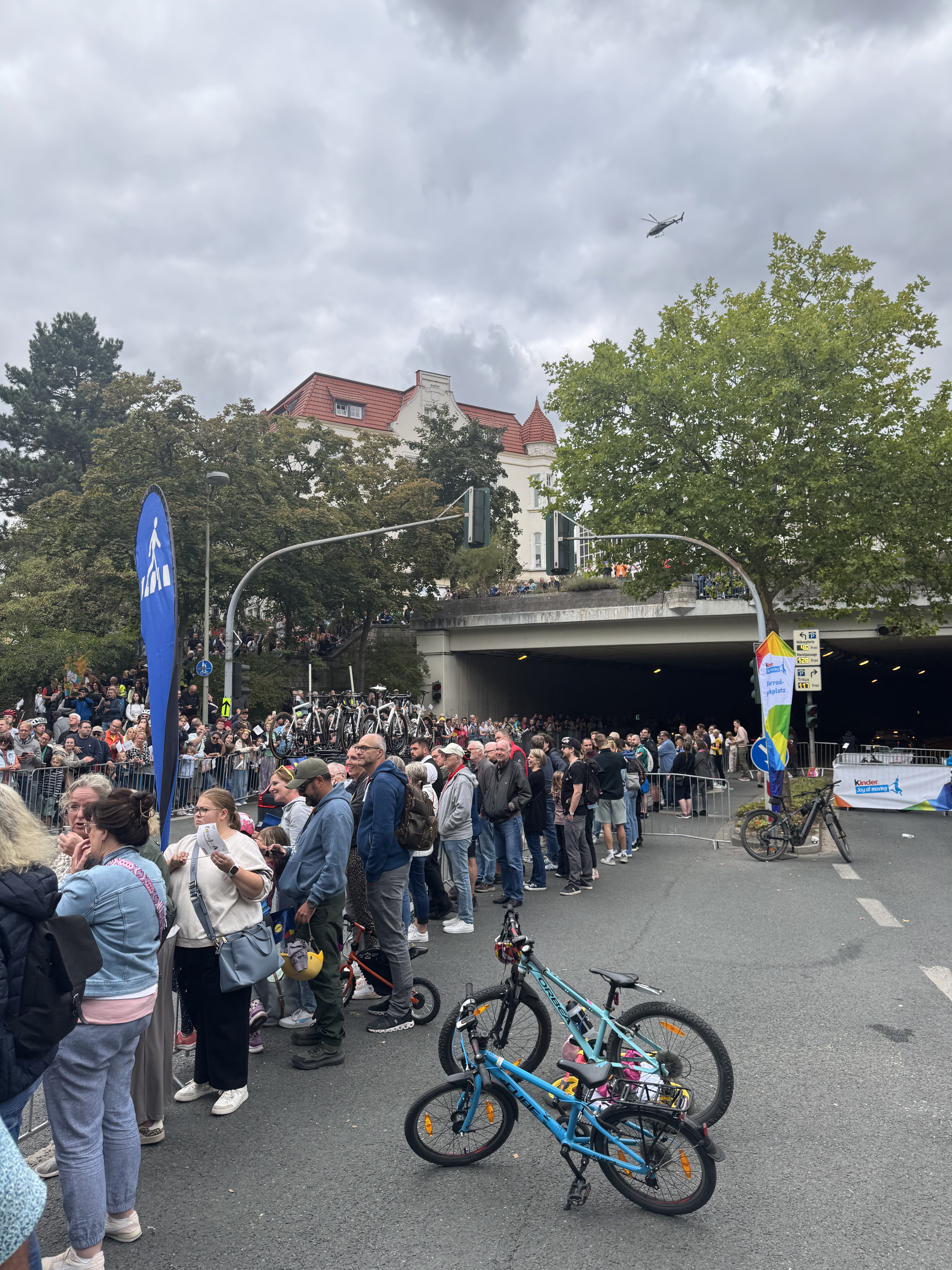 Ich komme rechtzeitig an, um die Zieldurchfahrt in Arnsberg mitzuerleben. Schon Kilometer vor der Stadt merke ich: hier ist etwas los. Die Zufahrtsstraßen voll mit Fahrrädern, Familien, Menschen in Trikots, die Stimmung fast wie bei einem Stadtfest. In der Innenstadt sind die Straßen gesäumt von Fans, Kinder wedeln mit selbstgemalten Schildern, ältere Herren diskutieren über Taktiken, und dann rauscht das Feld durch die Altstadt. Gänsehaut.